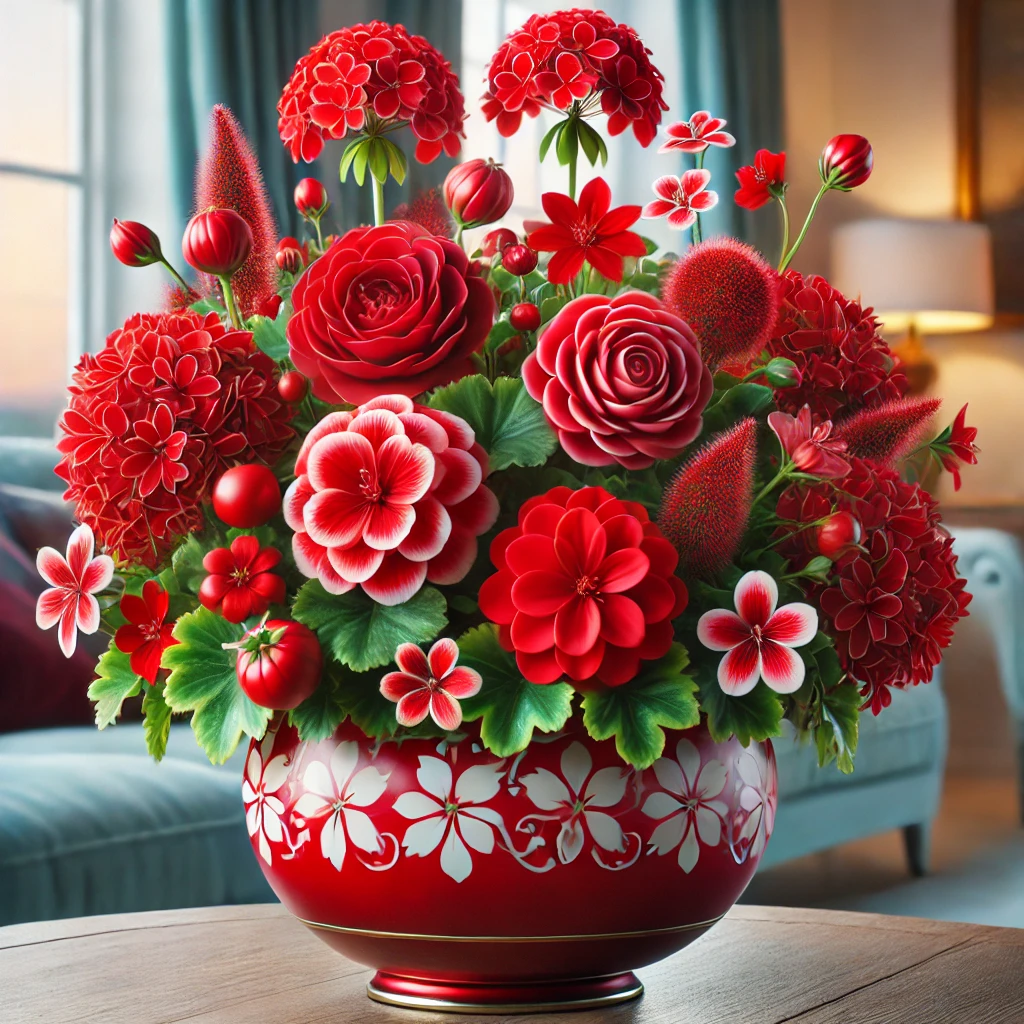 Герань — одно из самых популярных комнатных растений благодаря своей неприхотливости и обильному цветению. Ее круглые цветы бывают разных оттенков красного, от ярко-алого до темно-бордового. Герань отлично подходит для подоконников и балконов, хорошо сочетается с другими растениями.