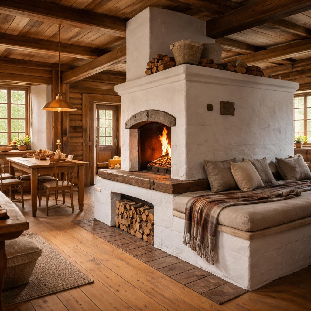 В то же время такой дом требует определённой дисциплины пространства. Захламлённость вокруг печи быстро разрушает ощущение уюта. Печь плохо переносит визуальный шум: она массивна сама по себе, и любое лишнее нагромождение рядом усиливает ощущение тесноты.